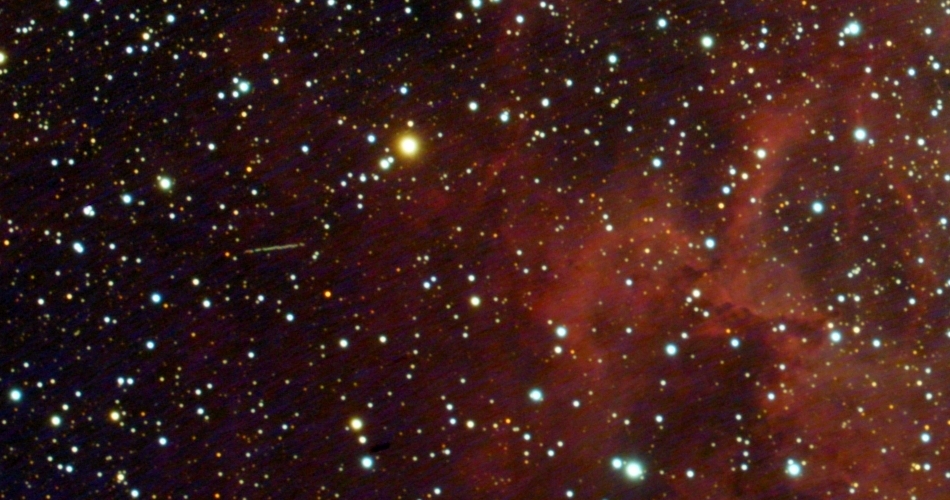 Strichspur eines von mir nicht identifizierbaren Asteroiden unmittelbar östlich des Rosettennebels NGC1499 (Mon) am 24.12.2025, f = 300 mm, QHY294C, IRB-Filter, skaliert auf 100% der Originalauflösung.