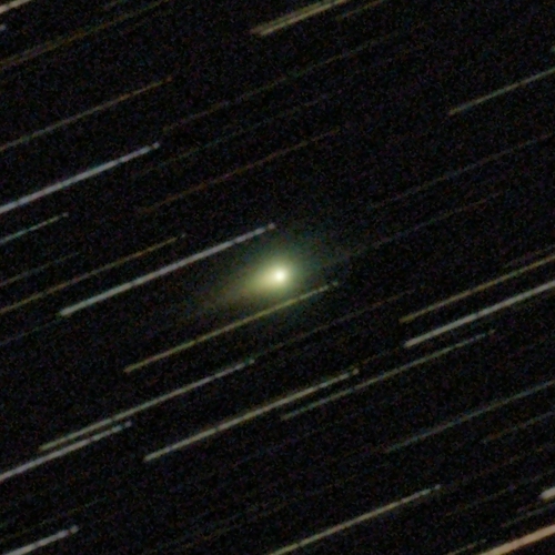 Interstellarer Komet 3I/ATLAS am 15.12.2025, f = 600 mm, QHY294C, IRB-Filter, 04:00 UT, 02:17 Stunden Belichtungszeit, 50%, 70% und 100% der Originalauflösung. Die Coma des Kometen erscheint elongiert, und sein kurzer Schweif ist ebenfalls sichtbar. Der äußere Bereich der Coma zeigt andeutungsweise eine grünliche C2-Emission, insgesamt wird die Coma jedoch durch das gelbliche, von der Staubkomponente gestreute Sonnenlicht dominiert.