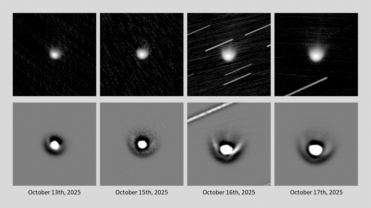 Komet C/2025 A6 (Lemmon) am 13.-17.10.2025, f = 600 mm, DZK 33UX250, 570-nm-Orange-Kantenfilter. Die Bilder wurde jeweils zwischen ca. 03:00 und 04:00 UT unmittelbar vor der Morgendämmerung auf dem Ballon d'Alsace unter hervorragenden Wetterbedingungen aufgenommen. Die obere Reihe zeigt jeweils das Intensitätsbild in identischer logarithmischer Skalierung, die untere Reihe die vergrößerte und hochpassgefilterte Variante. Deutlich sind dabei Staub-Jets zu erkennen, die orthogonal zur Richtung zur Sonne aus dem inneren Bereich der Coma austreten. Die untere Zusammenstellung zeigt den Kometen im Zeitraum 28.09.-16.10.2025 in einheitlichem Maßstab und illustriert so zeitliche Veränderungen der Größe der Staubcoma.