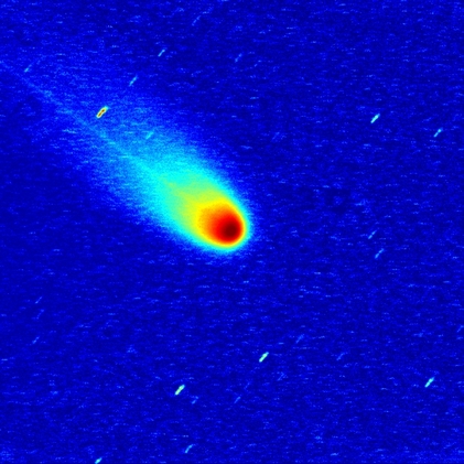 Komet C/2025 A6 (Lemmon) am 20.09.2025, f = 600 mm, QHY294C, IRB-Filter, 28:30 Minuten Belichtungszeit, 70% der Originalauflösung. Das Bild wurde um ca. 02:00 UT vor der Morgendämmerung durch eine Schicht aus mehr oder weniger dünnen Cirrus-Wolken aufgenommen. Die Farbversion zeigt, dass die Coma im grünen Licht der C2-Emission leuchtet. Außerdem ist die Coma in Richtung Nordwesten (oben rechts) leicht elongiert. Das invertierte und kontrastverstärkte Grauwertbild und das Falschfarbenbild zeigen andeutungsweise einen kurzen geraden Schweif, der ebenfalls in diese Richtung zeigt.