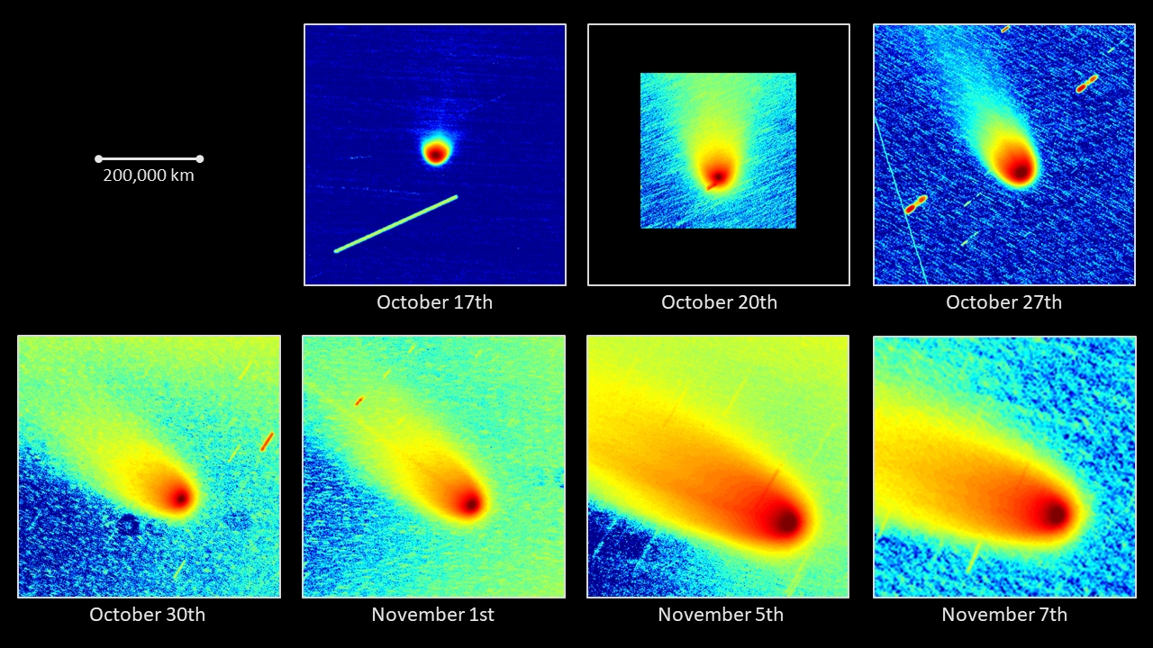 Komet C/2025 A6 (Lemmon) am 01.11.2025, f = 600 mm, DZK 33UX250, 570-nm-Orange-Kantenfilter, ca. 18:00 UT, 5:36 Minuten Belichtungszeit, im Vergleich zu den seit dem 17.10.2025 erstellten Aufnahmen. In der Zusammenstellung unten sind die Aufnahmeparameter der Kamera, die logarithmische Skalierung der Intensität und der Abbildungsmaßstab für alle Bilder identisch. Nach einer bis zum 17.10.2025 andauernden "Ruhephase" kam es im Zeitraum 17.-20.10.2025 zu einer schnellen Vergrößerung der Staubcoma und einer Aufhellung des Staubschweifs. In der darauffolgenden Woche (bis zum 27.10.2025) wurde der Schweif schwächer, die Staubcoma vergrößerte sich jedoch weiter. Einige Tage später (30.10.-01.11.2025) wurde der Staubschweif wieder heller, und die Staubcoma dehnte sich kontinuierlich aus. Diese Intensivierung der Staubkomponente ist wahrscheinlich auf die Annäherung des Kometen an die Sonne zurückzuführen, die zu einer Erwärmung der Oberfläche seines Kerns, zur Sublimation von Eis unter der Oberfläche und zur Freisetzung von Staubpartikeln aus dem Kern in die Coma und den Schweif führt. Die Entfernung des Kometen von der Sonne verringerte sich im Zeitraum 17.10.-01.11.2025 von 0.74 auf 0.56 AE, und das Perihel mit 0.53 AE Sonnenabstand wird am 08.11.2025 erreicht (JPL Horizons Ephemeris).