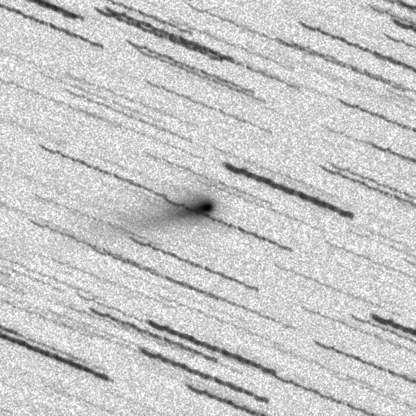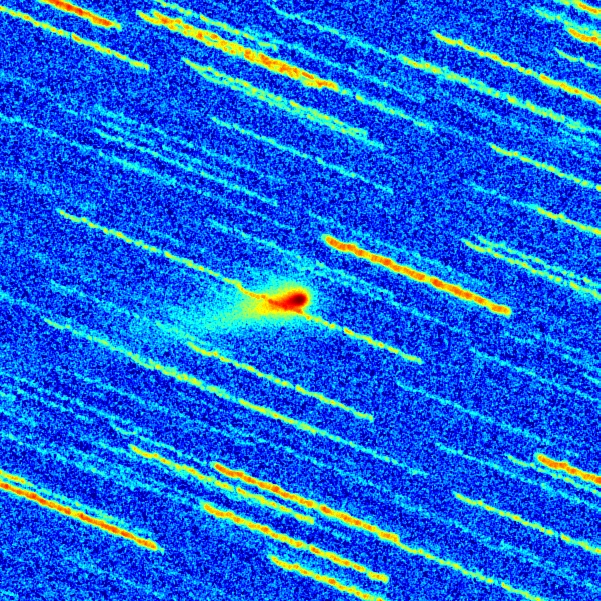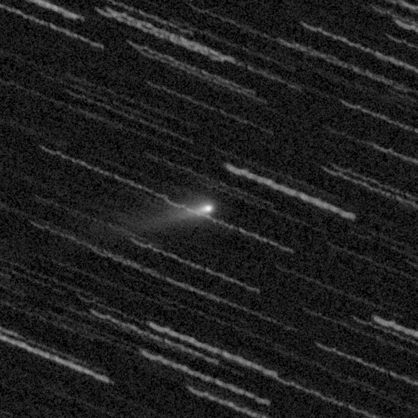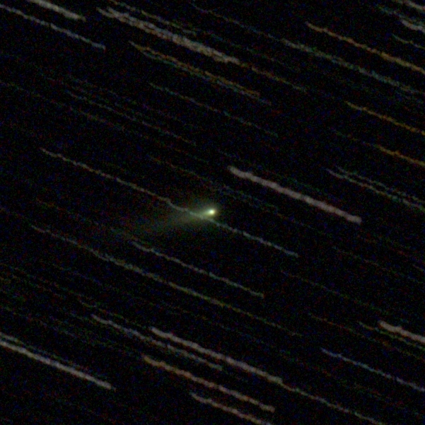 Komet C/2025 K1 (ATLAS) am 18.08.2025, f = 600 mm, QHY294C, IRB-Filter, 50 Minuten Belichtungszeit, 100% der Originalauflösung. Gemäß der JPL Horizons Ephemeris entspricht der Abstand des Kometen zur Erde 0.6 AE, während er 1.26 AE von der Sonne entfernt ist. Seine scheinbare Helligkeit wird mit 13.25 mag angegeben. Im Bild hat der Schweif des Kometen eine scheinbare Länge von nur 3.5 Bogenminuten, was einer projizierten Ausdehnung von etwa 90000 km entspricht. Aufgrund der Nähe des Kometen zur Erde ist seine scheinbare Bewegung am Himmel recht schnell und beträgt 6.5 Bogenminuten pro Stunde. Die ersten beiden Bilder zeigen den Kometen in Farbe und in Graustufen, das dritte Bild gibt eine mit Weißabgleich bearbeitete und farbverstärkte Variante wieder. Hier erscheint die Coma des Kometen grünlich und deutet auf eine C2-Emission hin, die charakteristisch für kohlenstoffhaltige Gase und/oder organische Verbindungen ist. Das stark kontrastverstärktes negative Grauwertbild zeigt die volle Ausdehnung des Schweifs, ebenso das nicht invertierte kontrastverstärkte Falschfarben-Grauwertbild.
