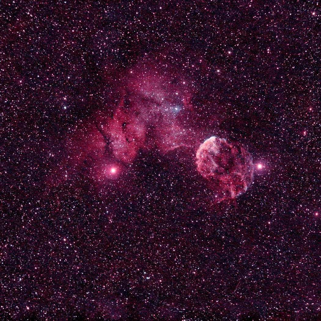 Mit dem Wolf-Rayet-Stern WR134 assoziierter OIII-Emissionsnebel (Cyg) am 10.06.2024, f = 600 mm, QHY294C, mit Hα+OIII-Filter, RGG-Bild, Rotkanal (Hα), Grünkanal (OIII), skaliert auf 35% und 100% der Originalauflösung (große Bilder skaliert auf 50%, 70% und 100% der Originalauflösung).